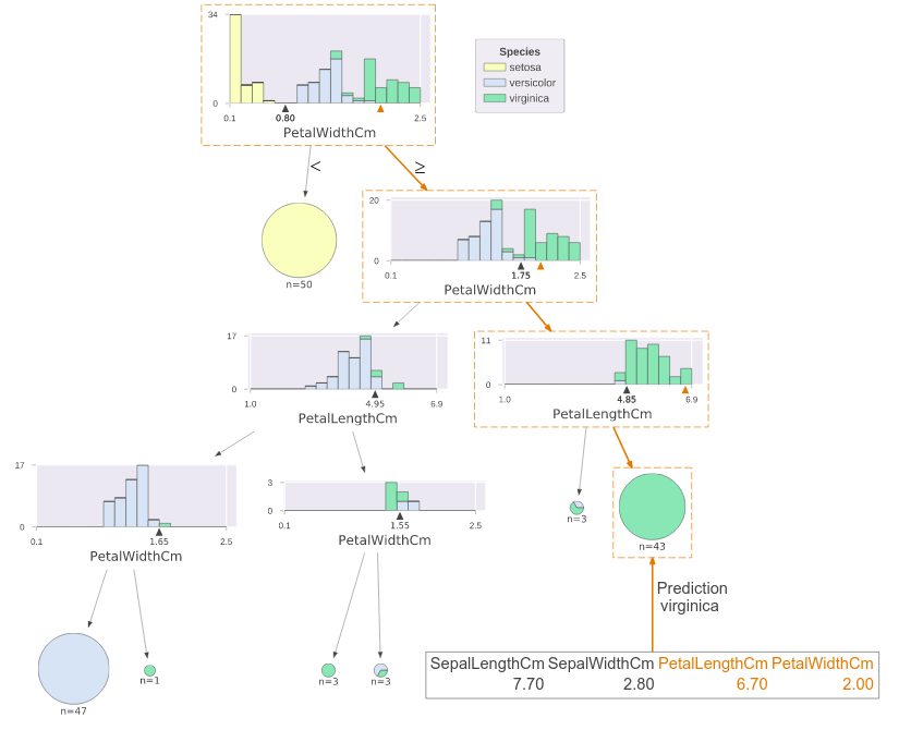 Let’s visualize the Decision Tree using the brilliant library dtreeviz and see how the model has learned the rules.