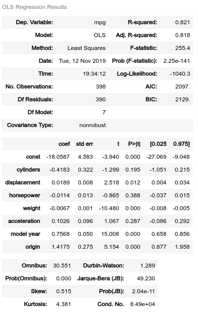 - Some features like cylinders, model year, etc, are categorical in nature. Such coefficients needs to be interpreted as the average difference in mileage between the different categories. One more caveat here is that all the categorical features are also ordinal(more cylinders means less mileage, or higher the model_year better the mileage) in nature and hence it’s OK to just leave them as is and run the regression. But if that is not the case, dummy or one-hot encoding the categorical variables is the way to go.