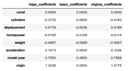 - It has completely shrunk cylinders, acceleration and origin to zero. Cylinders because of multicollinearity, acceleration because of its lack of predictive power(p-value in original regression was 0.287).