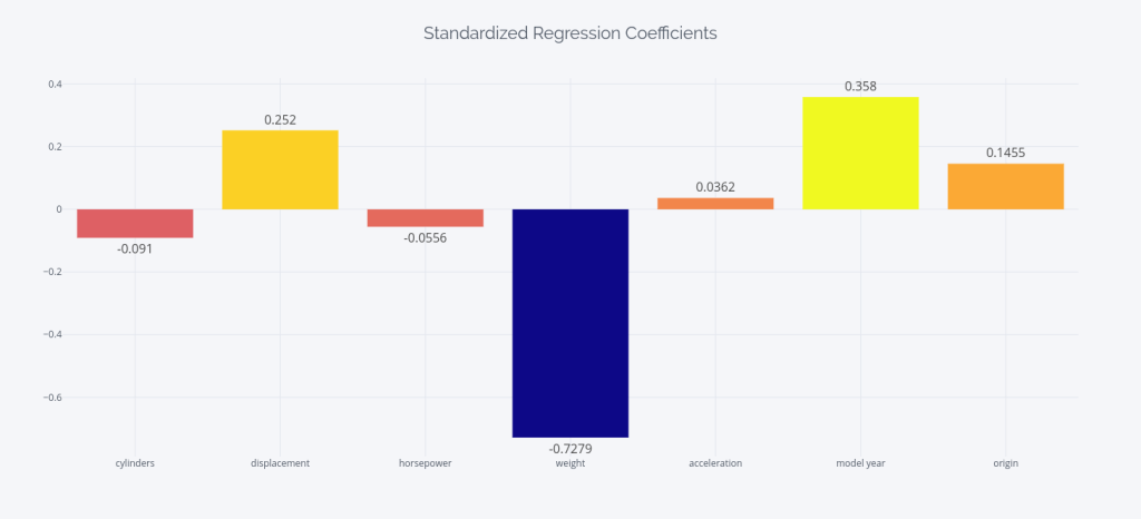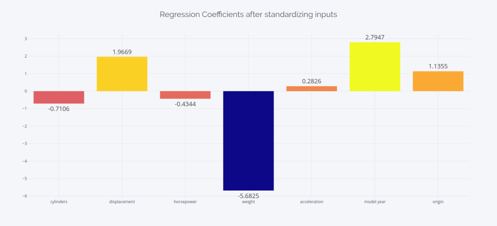 The picture really changed, didn’t it? Weight of the car, whose coefficient was almost zero, turned out to be the biggest driver in determining mileage. If you want to get more intuition/math behind the standardization, I suggest you check out this stackoverflow answer.