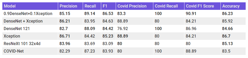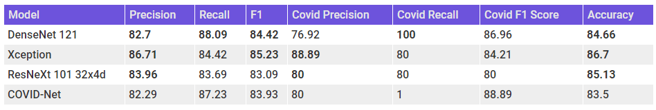 We can see right off the bat that all the models have a better accuracy than COVID-Net. But Accuracy isn’t the right metric to evaluate here. The Xception model, with the highest F1 score, seems to be the best performing model among the lot. But, if we look at Precision and Recall separately, we can see that COVID-Net is having high recall, especially for the COVID-19 cases, whereas our models have high Precision. Densenet 121 have a perfect recall, but the Precision is bad. But the Xception model has high precision and a not too bad recall.