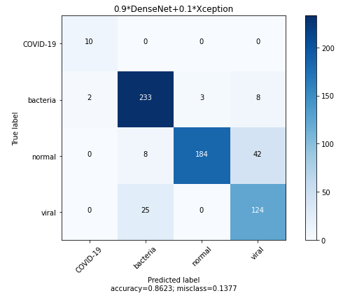 Not much different as before. Our ensemble still doesn’t have better recall. Let’s try a Weighted Ensemble to give more weight to Densenet which has a perfect recall in COVID-19. To determine the optimum weight, I use the predictions in the validation set and tried different weights.