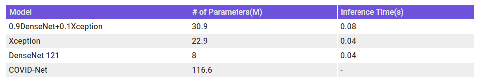 N.B. – Was not able to run inference on COVID-Net on my laptop(which has a terrible relationship with Tensorflow) and therefore do not know the inference time for the model. But by udging from the # of parameters, it should be more than the other models.