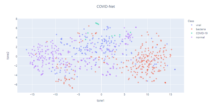 Let’s take a look at the t-SNE vizualizations, with Perplexity 50 for the three models – COVID-Net, Xception, DenseNet.