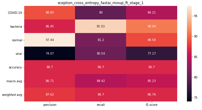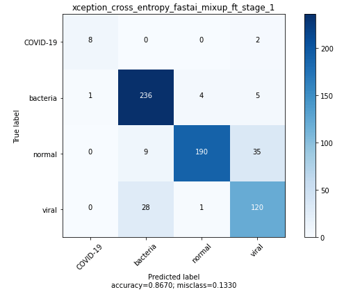 The best Xception model was trained using mixup and finetuned after initial pretraining with frozen weights.