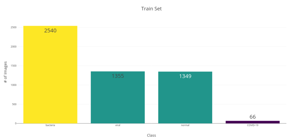 Along with this noise, there was an arxiv preprint came out of University of Waterloo, Canada by Linda Wang and Alexander Wong titled, COVID-Net: A Tailored Deep Convolutional Neural Network Design for Detection of COVID-19 Cases from Chest Radiography Images. In the paper, they propose a new CNN Architecture which was trained from scratch on a dataset of 5941 posteroanterior chest radiography images. To generate the dataset, they combined two publicly available datasets – COVID chest X-ray dataset, and Kaggle Chest X-ray images (pneumonia) dataset. In the paper, they divided this dataset into four classes – COVID-19, Viral, Bacterial, and Normal. The below bar chart shows the class distribution of train and test splits. This was a decently sized dataset, although the COVID cases were on the lower side. They reported a 100% Recall and an 80% Precision for the model.