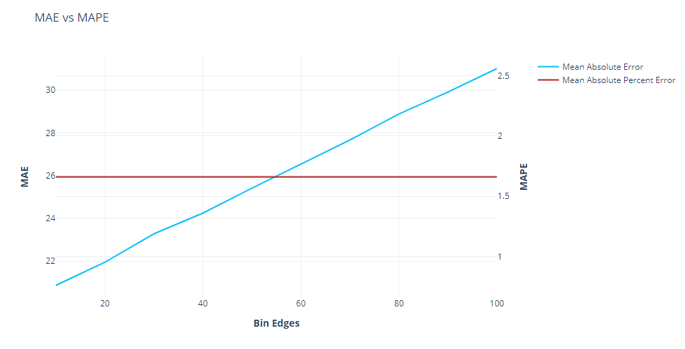 This is the Achilles heel of MAE. here, as we increase the base level of the time-series, we can see that the MAE increases linearly. This means that when we are comparing performances across timeseries, this is not the measure you want to use. For eg., when comparing two timeseries, one with a level of 5 and another with a level of 100, using MAE would always assign a higher error to the timeseries with level 100. Another example is when you want to compare different sub-sections of your set of timeseries to see where the error is higher(for eg. different product categories, etc.), then using MAE would always tell you that the sub-section which has a higher average sales would also have a higher MAE, but that doesn’t mean that sub-section is not doing well.