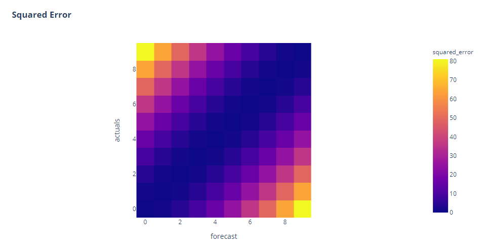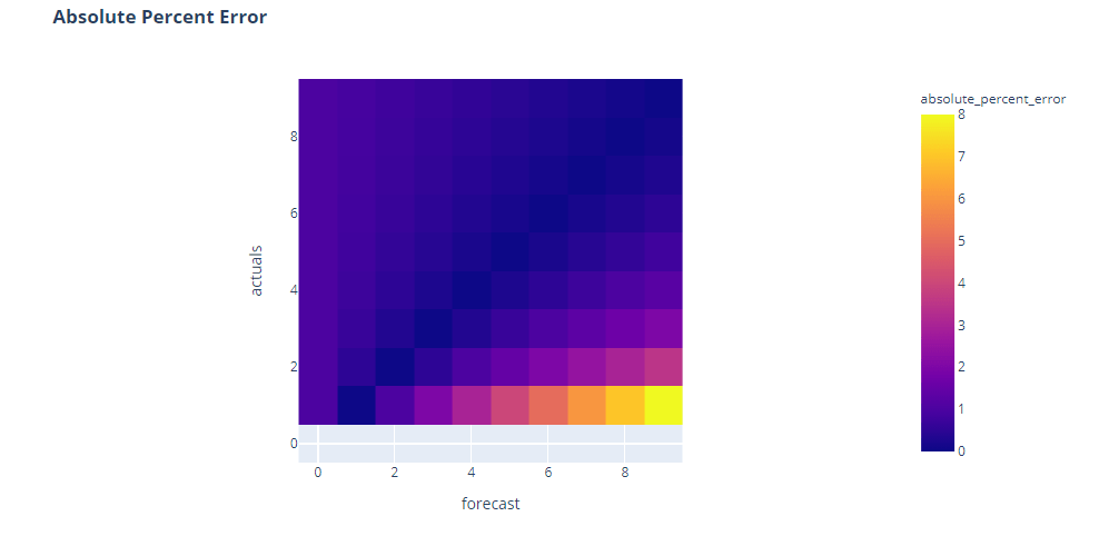 To test this, let’s make a grid of 0 to 10 for both actuals and forecast and calculate the error metrics on that grid.