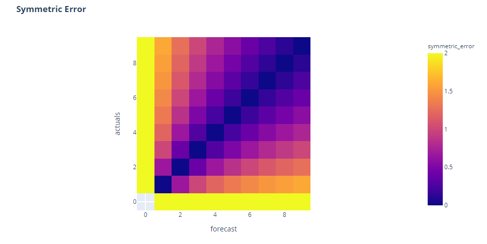 Right off the bat, we can see that this is symmetric around the diagonal, almost similar to Absolute Error in case of symmetry. And the bottom bar which was empty, now has colors(which means they are not undefined). But a closer look reveals something more. It is not symmetric around the second diagonal. We see the errors are higher when both actuals and forecast are low.