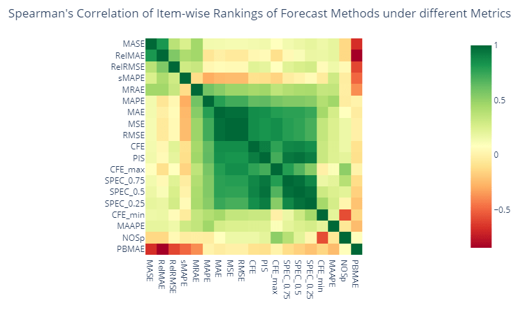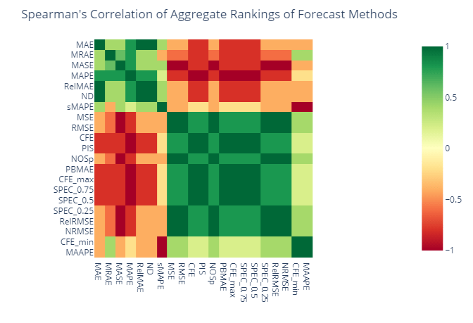 We have ranked the different forecast methods based on all these different metrics. And if a set of metrics are measuring the same thing, then these rankings would also show good correlation. So let’s calculate the Spearman’s Rank correlation for these ranks and see which metrics agree with each other.