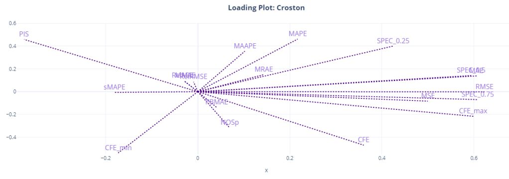 - MSE and CFE, even though it appears in the same place in the loading plots, does not show that relationship consistently across different forecasting methods. The same we can see in our loading plots as well. CFE is away from the second component for Croston and ETS.