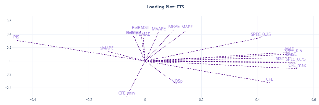 Here, we can see the relationship more crystalized. Most of the metrics are clustered together around the two components. MAE, MSE, RMSE, CFE, CFE_max, and the SPEC metrics all occupy similar space in the loading plot, and it looks like it is the component for “forecast bias” as CFE and SPEC metrics dominate this component. PIS is on the other side, almost at 180 degrees to CFE, because of the sign of PIS.
