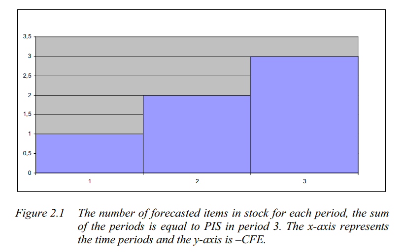 Let’s say there is a forecast of one unit every day in a three day horizon. In the beginning of the first period the one item is delivered to the fictitious stock (this is a simplification compared to reality). If there has been no demand during the first day, the result is plus one PIS. When a demand occurs, the demand is subtracted from the forecast. A demand of one in period 1 results in zero PIS in period 1 and CFE of -1. If the demand is equal to zero during three periods, PIS in period 3 is equal to plus six. The item from day one has spent three days in stock, the item from the second day have spent two days in stock and the last item has spent one day in stock