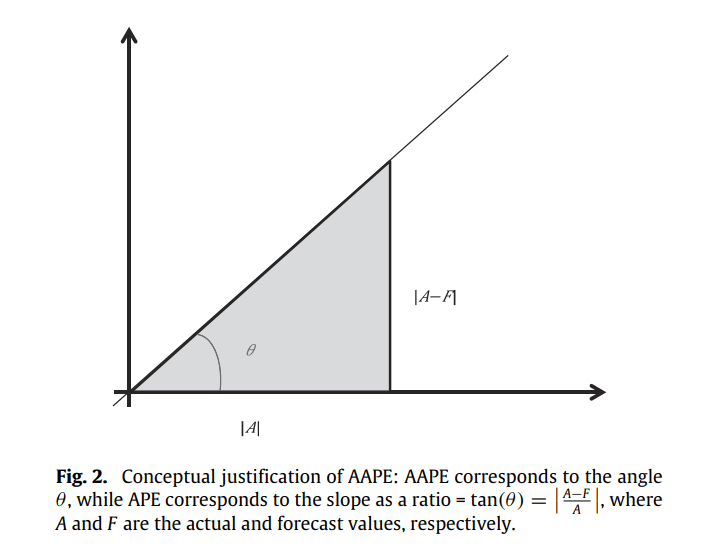 Slope can be measured as a ratio, ranging from 0 to infinity, and also as an angle, ranging from 0 to 90. The slope as a ratio is the traditional Absolute Percent Error that is quite popular. So the paper presents slope as an angle as a stable alternative. Those of you who remember your Trignometry would remember that: