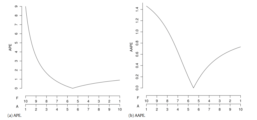We can see that AAPE still favours under forecasting, but not as much as APE and for that reason might be more useful.