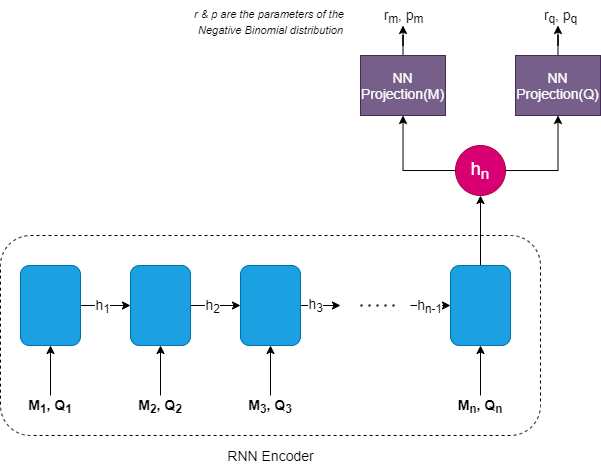 This means that we have a single RNN, which takes in as input both M and Q and encodes that information into an encoder(h). And then we put two separate NN layers on top of this hidden layer to estimate the probability distribution of both M and Q. For both M and Q, Negative Binomial distribution is the choice suggested by the paper.