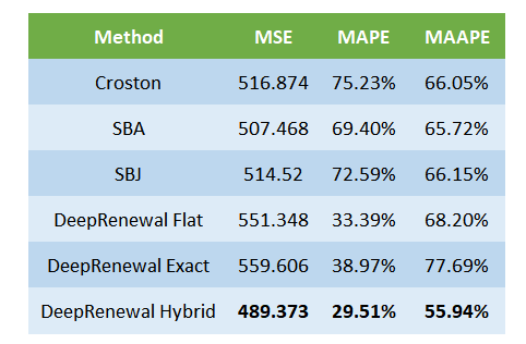 Once Croston forecasting was cast as a renewal process, Turkmen et al. proposed to estimate them by using a separate RNN for each “Demand Size” and “Inter-demand Interval”.