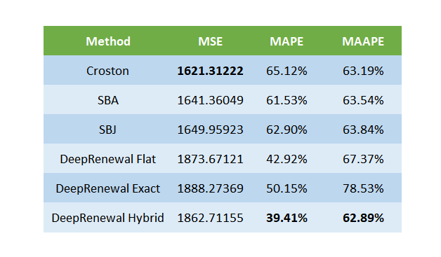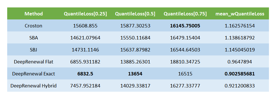 The baseline we have chosen, as the paper, is Croston Forecast. We have also added slight modification to Croston, namely SBA and SBJ. So let’s first do a comparison against these baselines, for both one-step ahead and n-step ahead forecasts. We will also evaluate both point forecast(using MSE, MAPE, and MAAPE) and probabilistic forecast (using Quantile Loss)