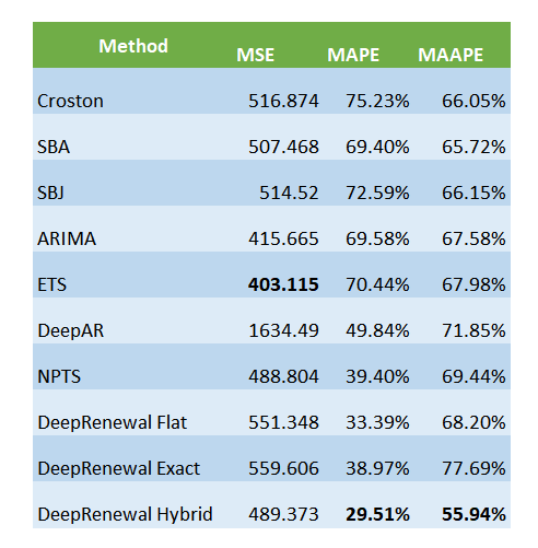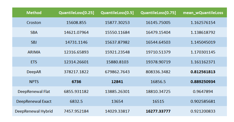 For an extended comparison of the results, let’s also include results from other popular forecasting techniques as well. We have added ETS and ARIMA from the point estimation stable and DeepAR and NPTS from the probabilistic forecast stable.